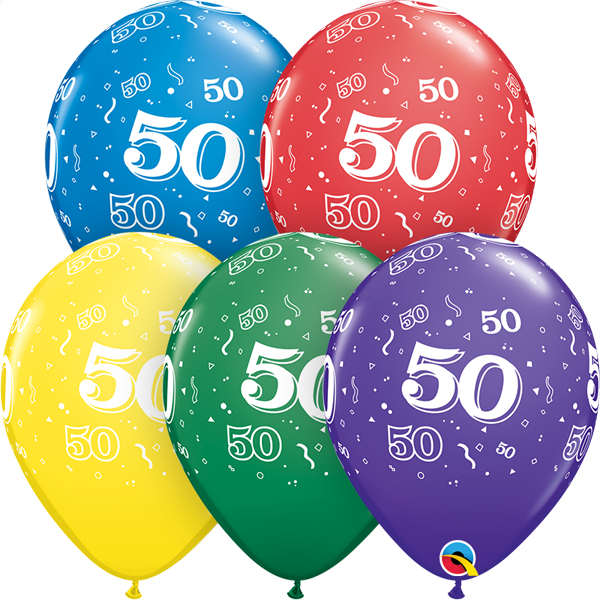 50 Confetti-A-Round printed latex balloons comes in an assortment of primary colours.  These high quality balloons in these vibrant colours and sharp imprint colour will be an excellent addition to your special birthday milestone celebration.  These are an excellent helium quality latex balloon.